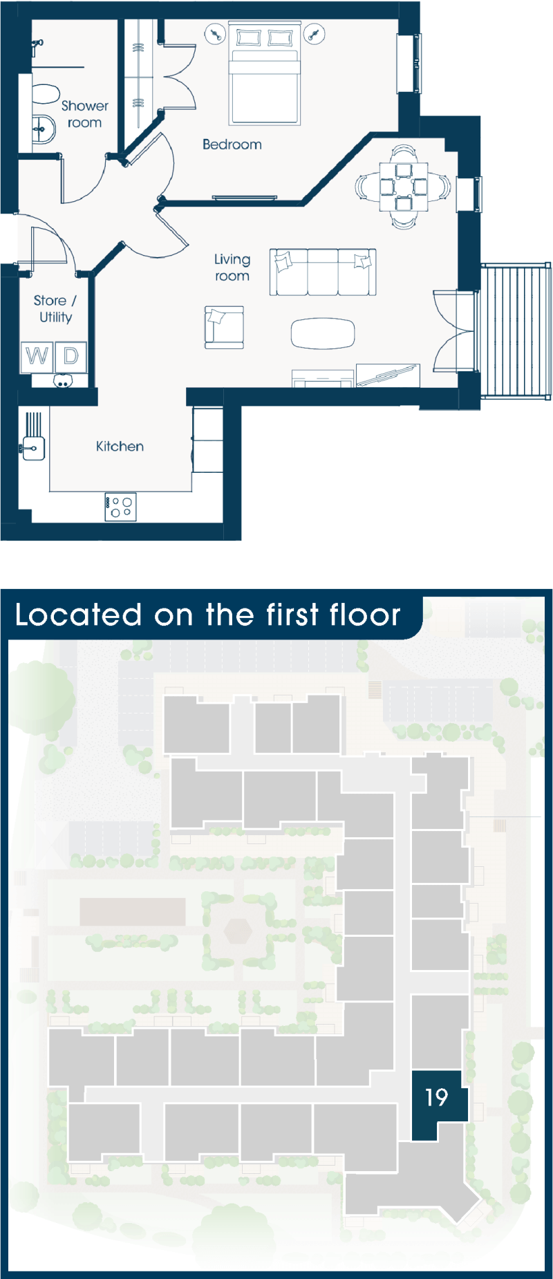 A one bedroom deluxe apartment with walk-out balcony, located on the first floor. With 80% wool blend fitted carpets throughout, a spacious lounge with feature fireplace and integrated electric fire, and a luxurious kitchen with integrated appliances.