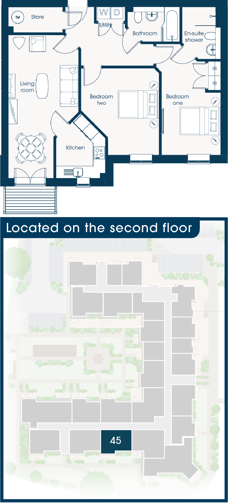 A South facing two-bedroom en-suite apartment with walk-out balcony, located on the second floor and overlooking beautifully landscaped gardens. There are fully fitted 80% wool blend carpets throughout and a contemporary feature fireplace with integrated electric fire in the lounge.