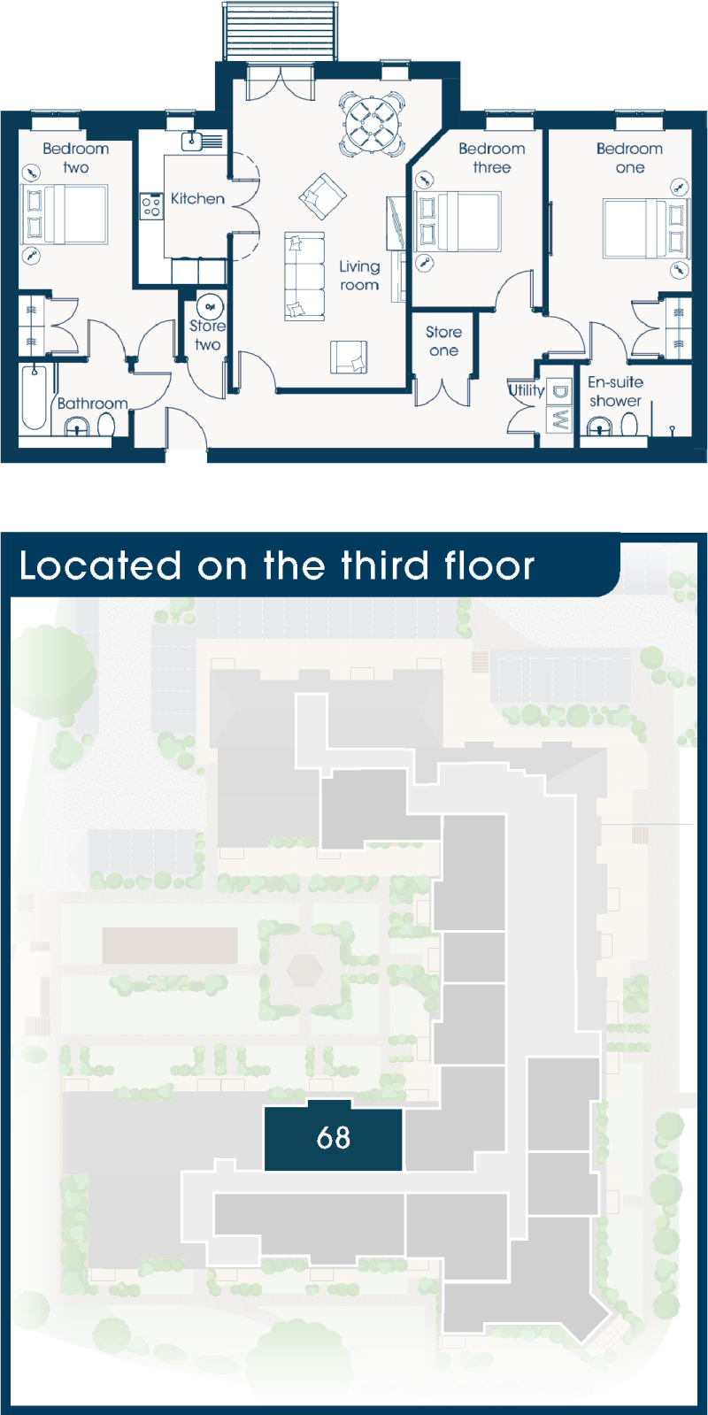 Apartment 68 is a spacious three bedroom en-suite apartment with walk-out balcony on the third floor, with beautiful views over the landscaped gardens.