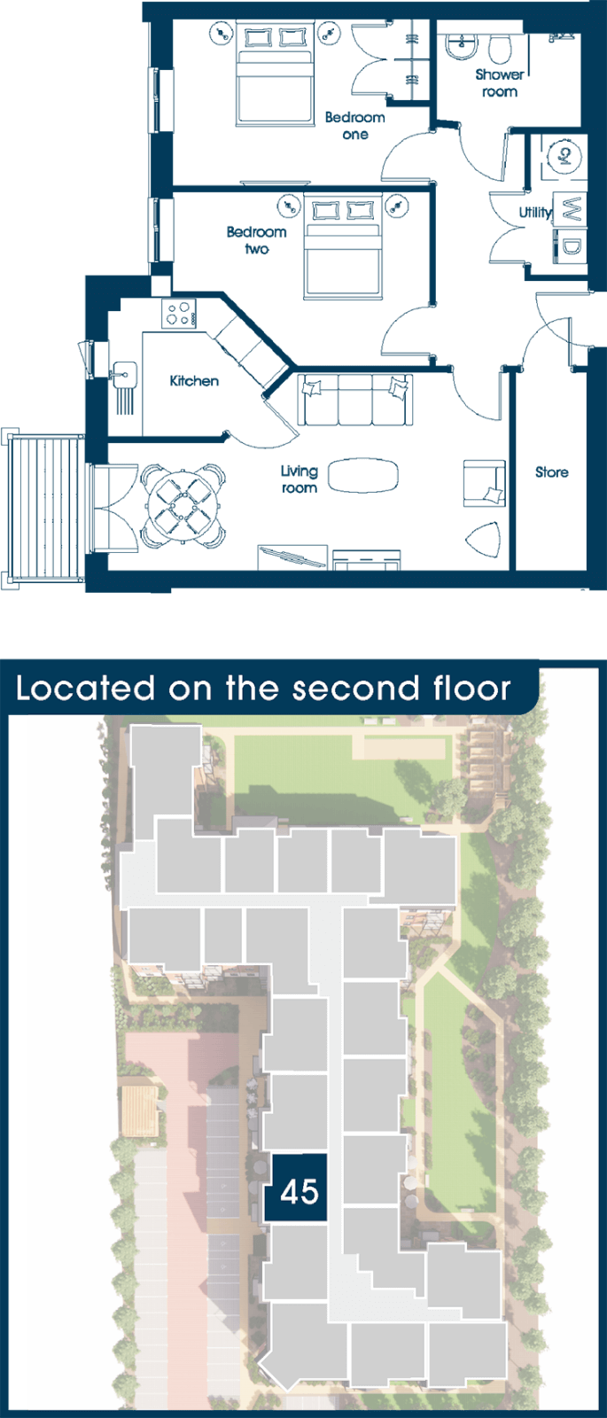 Apartment 45 is a two-bedroom apartment with walk-out balcony on the second floor. With fitted carpets throughout, a spacious lounge with feature fireplace and integrated electric fire, and a luxurious kitchen with integrated appliances.