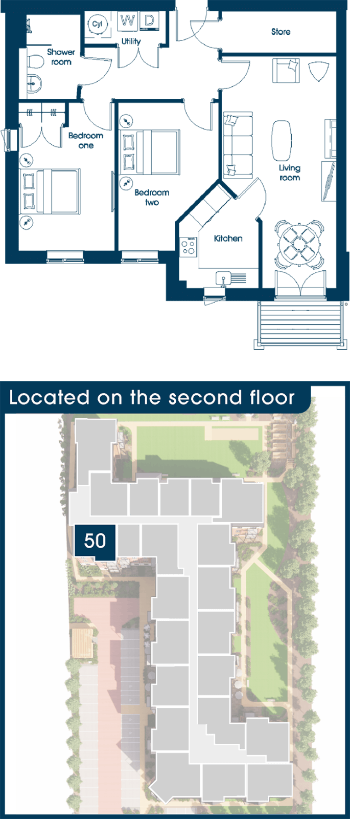 Apartment 50 is a two-bedroom apartment with walk-out balcony on the second floor. With fitted carpets throughout, fitted wardrobes in the master bedroom, and a luxurious kitchen with integrated appliances.